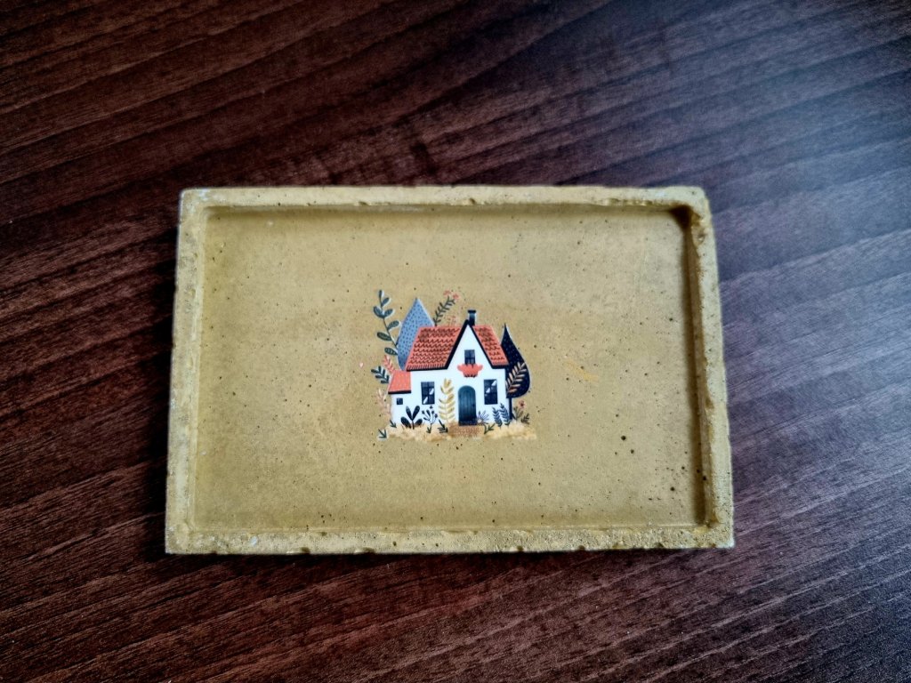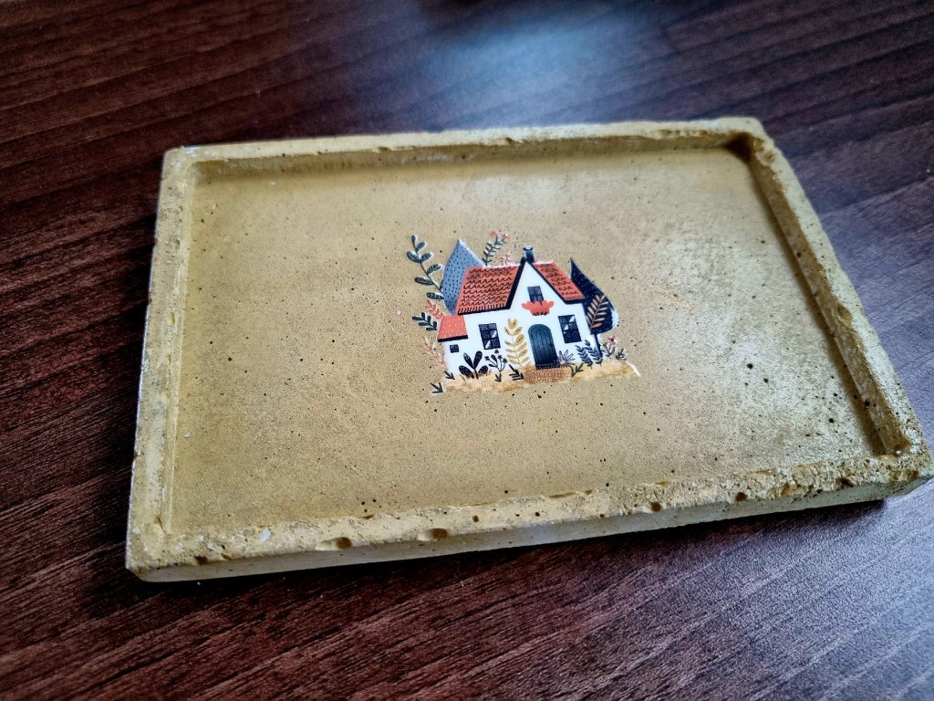 A meleg árnyalatú beton és a ház motívuma finom kontrasztot alkot, ami az otthonosság érzetét erősíti.