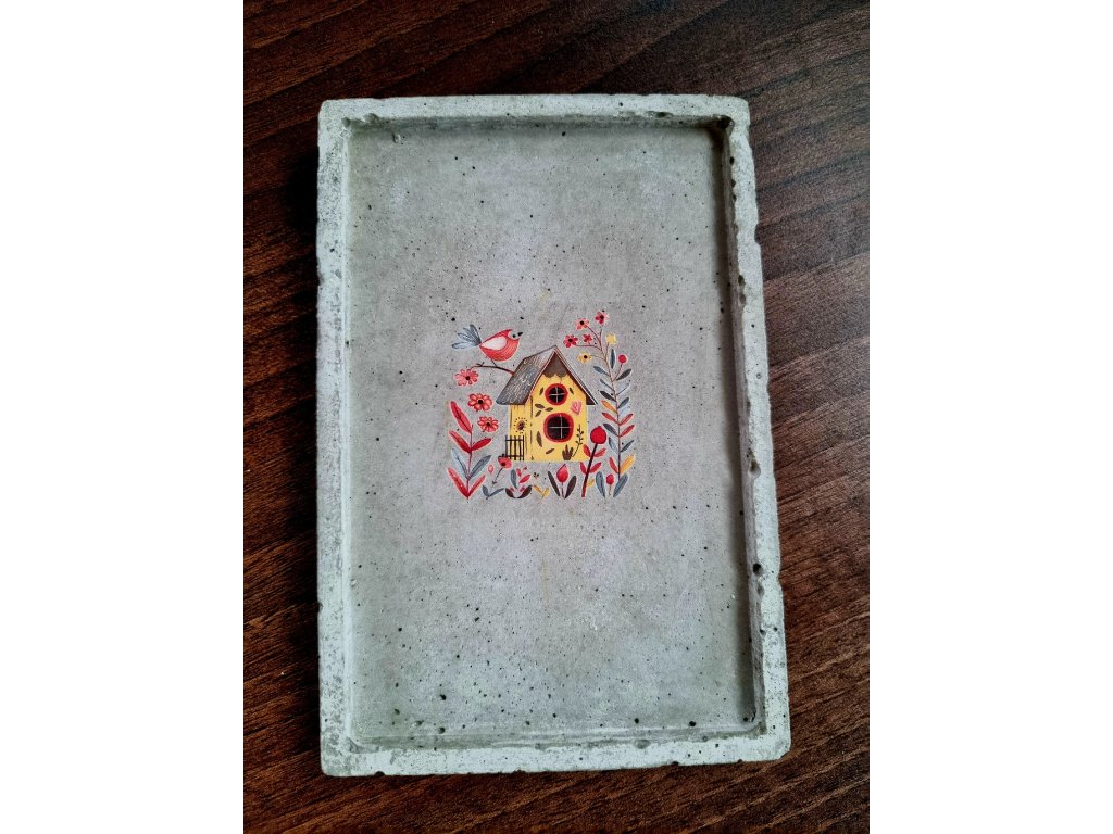 A beton érdes textúrája és a madaras motívum játékos, természetközeli összhangot teremt.