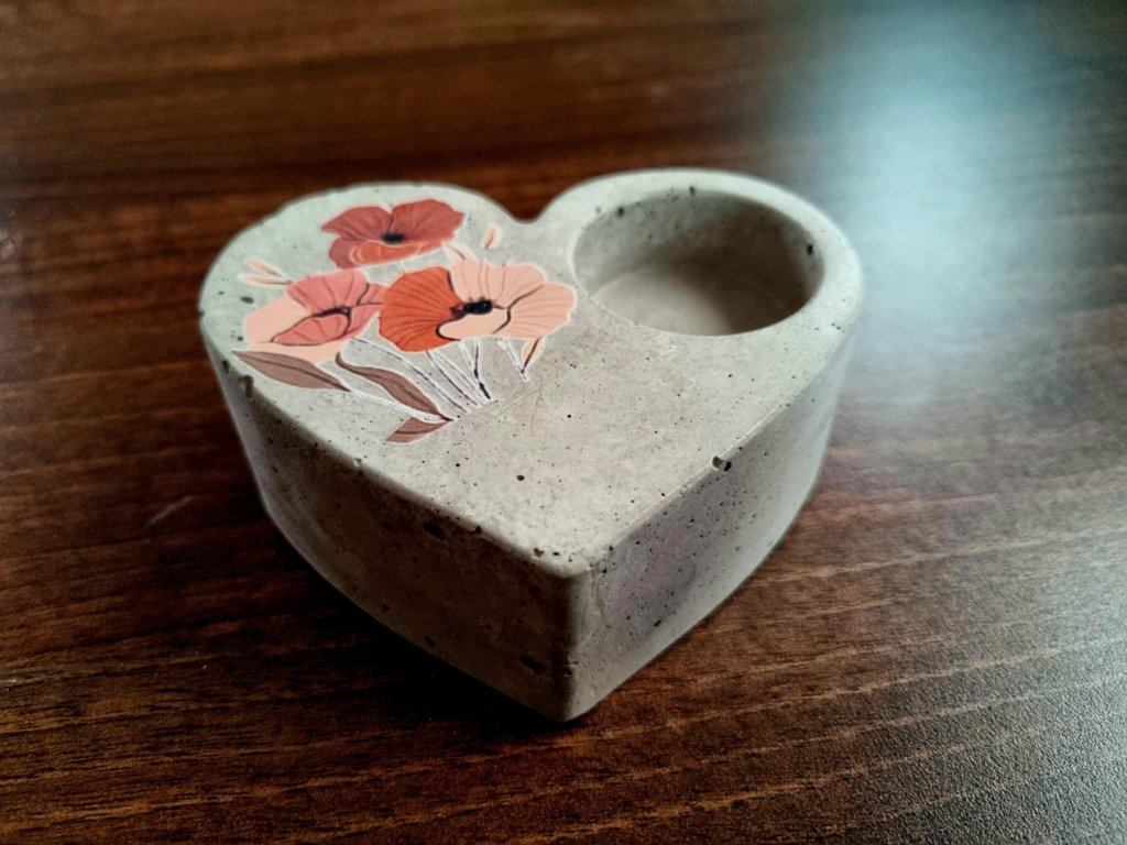 Szív alakú beton mécsestartó – pipacsos virágmintával