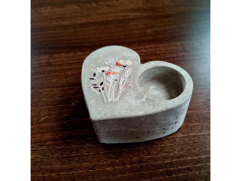 Szív alakú beton mécsestartó – vadvirágos mintával